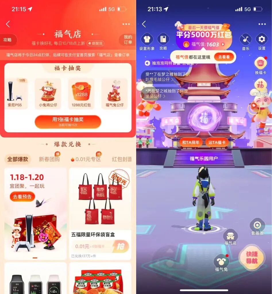 这套机制的具体运行效果如何,泡泡玛特在支付宝收割流量红利的案例,已经被奉为经典。公司相关业务负责人曾透露,泡泡玛特在去年国庆期间曾结合支付宝大促策划了一场营销活动,以已成为一种平台心智的优惠券作为介质,打通了线上小程序和线下门店,最终利用仅一万元的成本在15天内实现了近5000万的成交额,销售额翻倍,新增10万品牌新用户。尝到甜头之后,今年五福泡泡玛特“乘胜追击”。公开数据显示,在福气乐园上线专属品牌馆,五福首周交易量增长超3倍,在福气店推出的新春款红包封面上线三天被疯抢44万张。