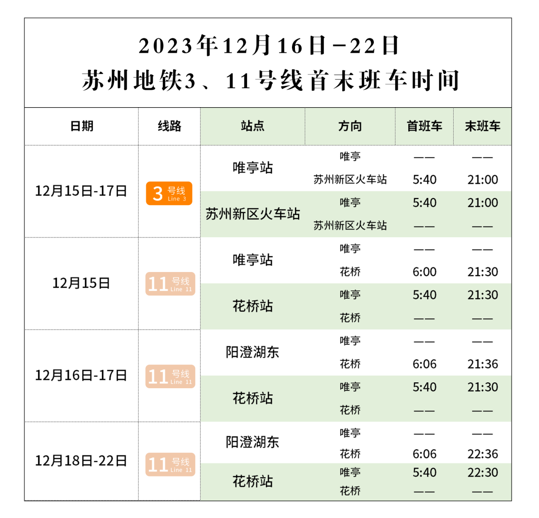 2023年12月15日至17日,11号线提前1小时结束运营,晚间大站快车取消;12月15日唯亭站、花桥站末班车为21:30;12月16-17日阳澄湖东站末班车为21:36,花桥站末班车为21:30;