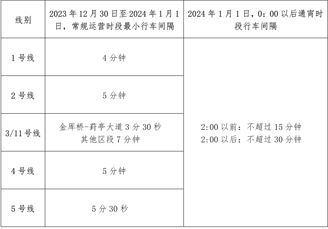 1.元旦跨年夜(2023年12月31日),线网各线路通宵运营。次日2:00以前各线路行车间隔不超过15分钟,次日2:00以后各线路行车间隔不超过30分钟。