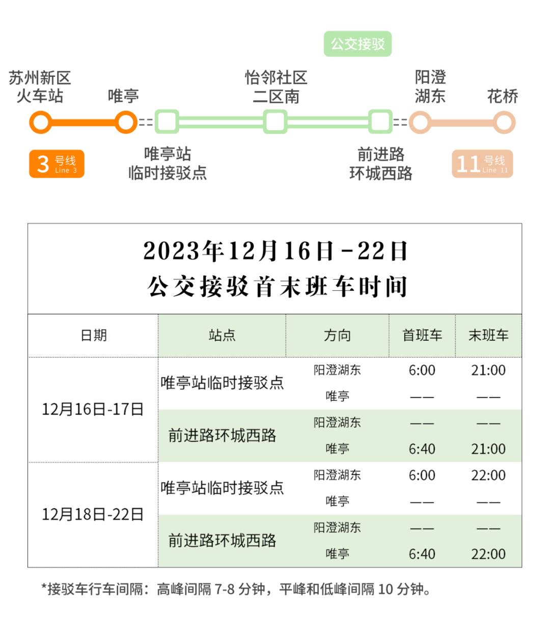 重要提示:上述影响时段,3/11号线各站列车时刻表将提前通过苏州轨道交通乘车APP“苏e行”发布,唯亭站至阳澄湖东站公交接驳单程旅行时间约30分钟,实际受地面交通路况影响会有所偏差,请您提前做好出行规划,感谢您的理解与支持!