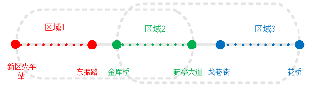 02区域1至区域3(需换乘一次)从区域1内车站前往区域3内车站,需在区域2内任意车站下车并原站台等待换乘下一趟列车。