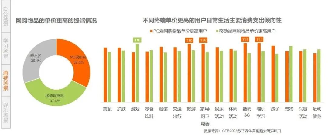 ● PC端网购物品单价更高的用户占比32.5%,PC端网购物品单价更高的用户日常生活主要消费支出在旅游、家电/厨卫电器、数码3C、培训学习上的倾向性更强。