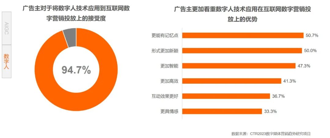 ● 94.7%的广告主对于将数字人技术应用到互联网数字营销投放上表示接受,认为数字人技术用在互联网数字营销上更能具有记忆点。