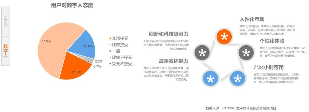 ● 79.1%用户表示接受将数字人应用到广告与品牌内容传播上,整体接受度较高;数字人提供了一种与用户互动的新方式,通过模拟人类的行为和情感,能够更深层次地吸引用户,增加用户对品牌的亲切感。