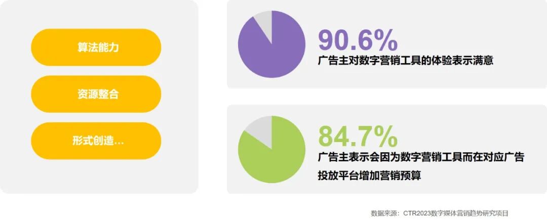 ● 90.6%的广告主对数字营销工具表示满意,84.7%的广告主愿意为数字营销工具增加营销预算。