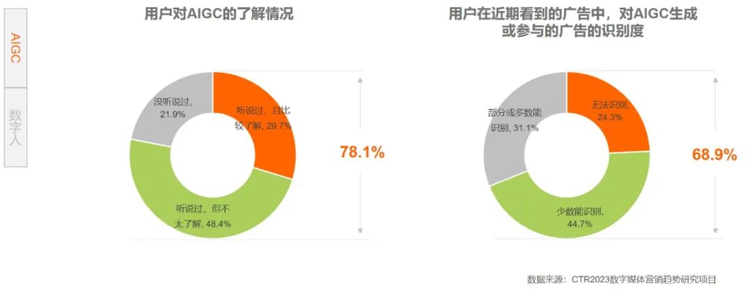 ● 此外,对于AIGC生成或参与生成的广告,近七成用户表示无法识别或只有少数能识别。因此在实际营销中,AIGC替代人工可行性高,具备较强竞争力。