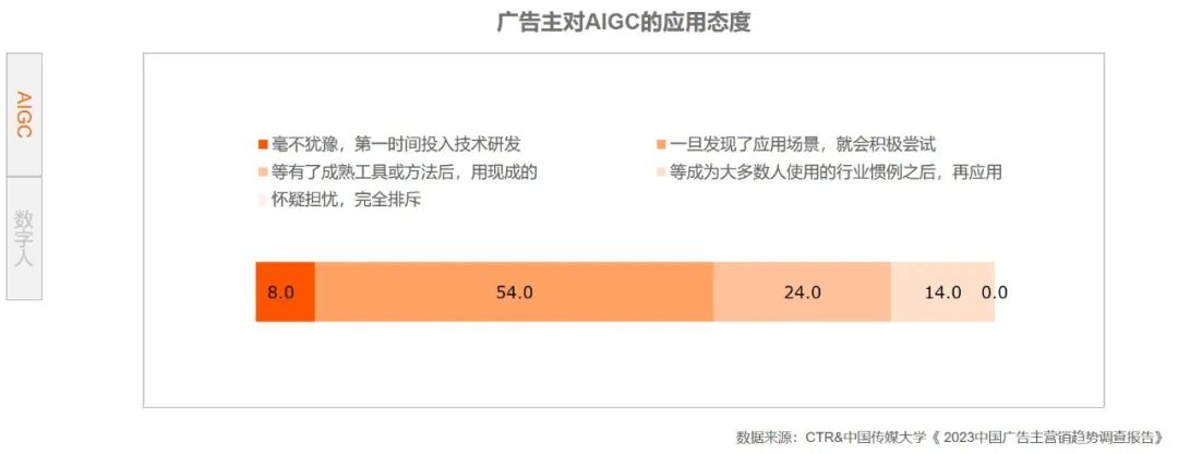 ● 总体来说,广告主对AIGC的应用态度呈积极状态。其中,超过半成的广告主一旦发现了AIGC应用场景,就会积极尝试。