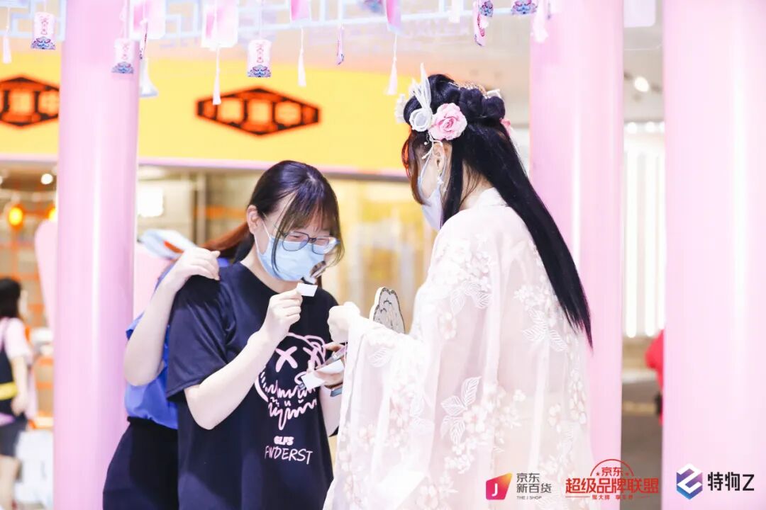 在线下,京东美妆联合特物Z和超级品牌联盟在上海外滩来福士打造了充满浪漫气息的七夕主题展览。爱情氛围拉满的七夕定制场景、古风服饰coser以及趣味互动,吸引了大量消费者前来打卡参与。消费者纷纷写下爱情宣言,体验七夕美妆定制,并拍摄趣味照片自发传播,积极参与互动领取美妆福利。沉浸式体验古风七夕节,让消费者近距离感受到了美妆品牌及产品的魅力,不仅吸引了更多用户参与互动与传播,更实现了线上线下联动,直接促进销量转化。
